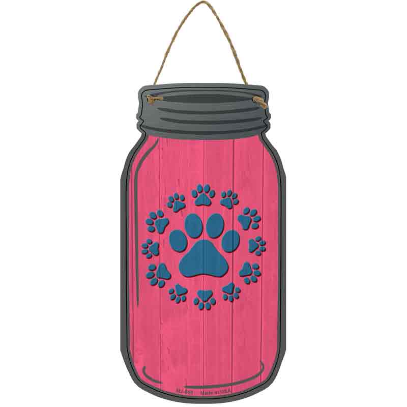 Paw Print Circle Pink Novelty Metal Mason Jar Sign. 4" x 8" high gloss metal mason jar sign. Made of the highest quality aluminum for a weather resistant finish. It is lightweight and durable. Pre-drilled holes for quick and easy mounting. Add a ribbon, magnet, or wood stand to personalize your sign. Comes with an 8" string for hanging. Proudly made in the USA. Most orders ship within 24-48 hours.